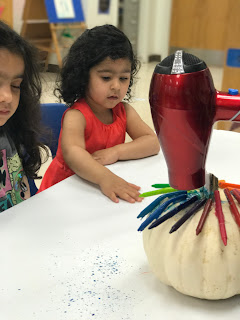 One of the favorite activities this week was creating a “Drip Art” Pumpkin. The children were fascinated by this project! It was exciting to watch the crayons melt and blend together to create a beautiful design. If you would like to recreate this craft at home all you need is a pumpkin, a hot glue gun or super glue, crayons and a hairdryer! Watch our time lapse video here: https://photos.app.goo.gl/ahgkEPCMW9iToGxy1