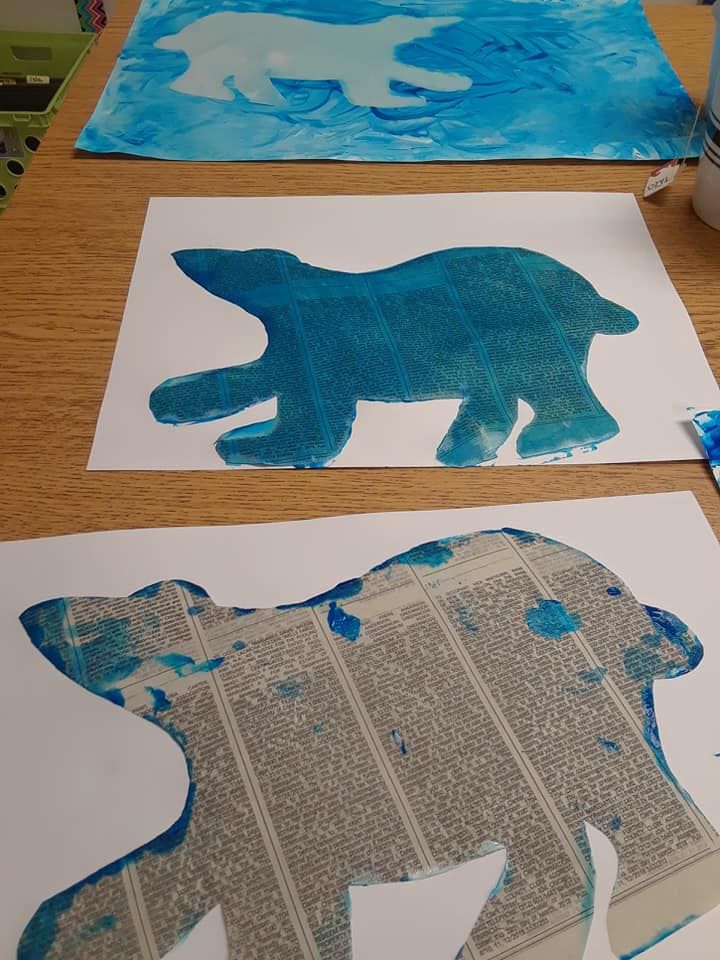 Process art is all about the experience the children have while they are creating. If it has a nice end product, that's great, but the end product isn't the focus of process art. For our polar bear process art activity the children got messy and used their hands over the white piece of paper with blue and white paint. Between the paint and the white paper was a newspaper polar bear template that we peeled off after the kiddos finished painting and revealed the white paper underneath!